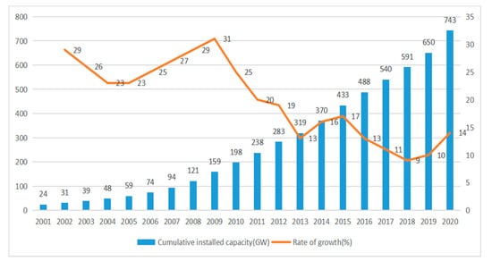 Global cumulatively installed wind power capacity and rate of growth in 2001–2020 (GW, %).