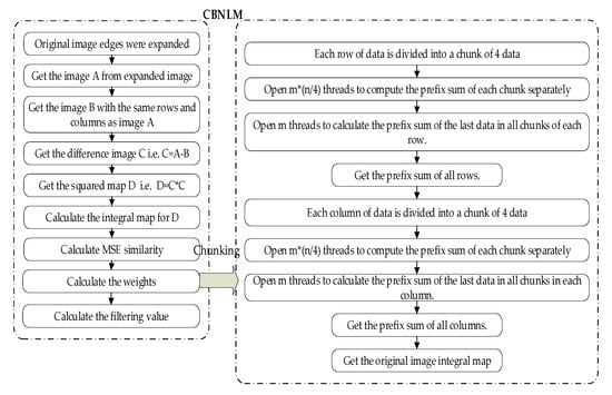 It is well known that for an image the prefix sums of all its rows are calculated separately to obtain the prefix-sum image. The prefix sum of all columns is then calculated separately for the image of the row prefix sum to obtain the integral image. The flowchart of the complete CBNLM is shown in Figure 3. The critical process of the CBNLM for m-row and n-column images consisted of the following nine steps.