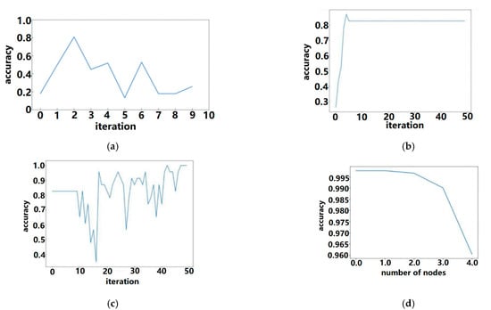 A line chart for the variation in damage recognition accuracy with the number of iterations for each neural network algorithm is shown in Figure 6. It could be seen from the figure that the accuracies of ResNet, VGG19 and AlexNet did not increase with the increase in iterations, but remained unchanged within a certain range. Different from other deep networks, the accuracy of the CBNLM-BLS was changed by adjusting the number of nodes. The horizontal coordinate in Figure 6d represents the number of increases of enhancement nodes. The figure shows that the accuracy of the CBNLM-BLS decreased with the increase in the number of nodes. This was because the enhancement nodes that were converted were sufficient to extract enough features to obtain an accurate classification result after the images were fed into the model.