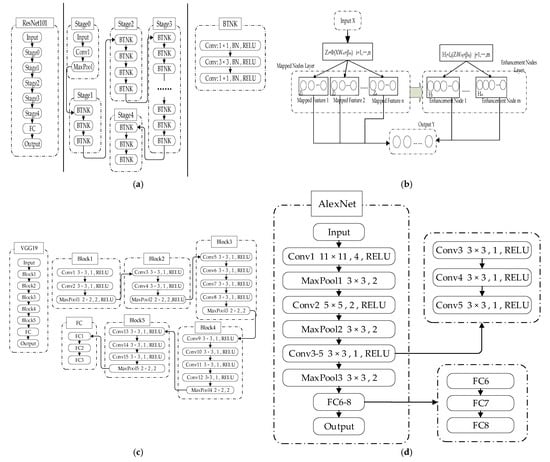 Structure of models. (a) Structure of ResNet; (b) structure of the CBNLM-BLS; (c) structure of VGG19; (d) structure of AlexNet.
