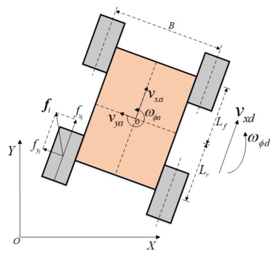 The skid-steering vehicle investigated in this study is shown in Figure 1, which is equipped with four independently driven wheels, forming a differential steering system. is the reference coordinate system, is the fixed coordinate system attached to the vehicle, and o represents the origin of the fixed coordinate system. B is the width of the vehicle. The distances from the center of gravity (CG) to the front and rear wheels are and , respectively. As shown in Figure 1, the motion of the skid-steering vehicle is caused by the friction forces, which are generated by the wheel–ground interactions. The dynamics model is formulated as follows: