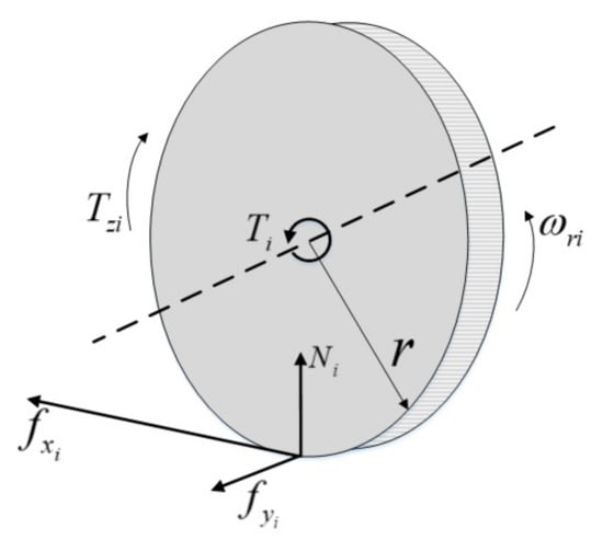 where is the force of the driving wheel in the vertical direction, is the friction coefficient, is the dynamic feature of the friction force, is the longitudinal slip, and is the lateral slip. The slips in different directions are defined as follows: