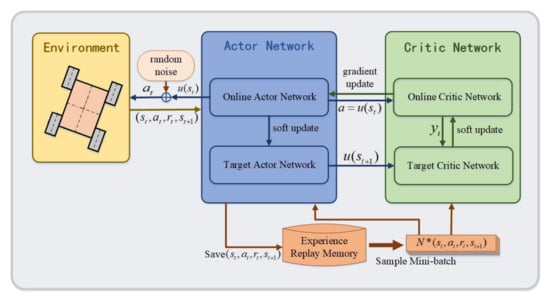 The DDPG algorithm [40] is a mature RL algorithm that can be used to deal with continuous action control. The idea of experience replays and random sampling are incorporated into the DDPG algorithm, and the process of establishing the target network is, also, considered. The DDPG is an actor–critic algorithm, where the basic framework includes actor networks and critic networks. The actor networks are used for policy search, while the critic networks are used for value function approximation. As shown in Figure 3, the DDPG algorithm includes two actor networks and two critic networks.