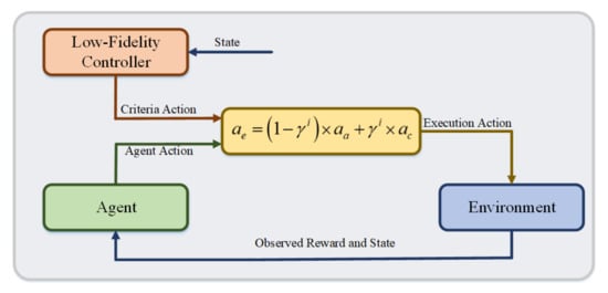 During the learning process, the agent learns from previous experience, by continuously interacting with its environment, and generates reasonable actions through the powerful fitting ability of the neural network. At the beginning of learning, the actions are randomly generated by the agent, which means that actions with low rewards are likely to be generated. Although the control performance of the low-fidelity controller cannot meet the requirements, it still greatly outperforms the control of randomly selected actions. Thus, the low-fidelity controller is used to assist the agent to learn quickly, by generating criteria actions; that is, it acts like a teacher when the agent has just started learning, guiding the direction of learning. The core idea of the criteria action method is to assist the agent in searching for actions at the beginning of learning, reducing randomly selected actions. The framework of the criteria action method is shown in Figure 5.