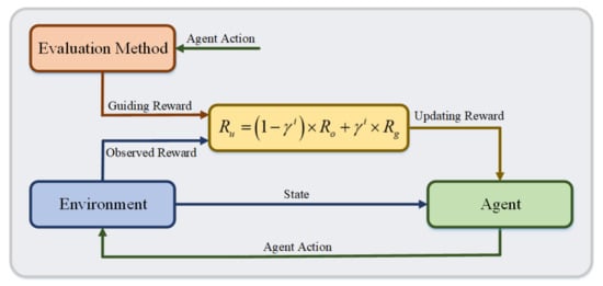 Unlike the original DDPG algorithm, which directly uses the observed reward as the updating reward to update the policy directly, in the KA-DDPG algorithm, we adjust the observed reward, with the help of the evaluation method, to sharpen the updating reward, which can accelerate the agent’s learning process. The guiding reward method is proposed to adjust the updating reward, and its framework is shown in Figure 6.