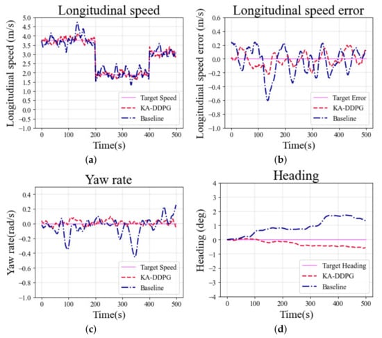 Figure 8a shows a comparison of longitudinal speed tracking, for the different torque distribution methods in the straight scenario. To more clearly demonstrate the tracking performance for longitudinal speed, Figure 8b shows the corresponding tracking error. The tracking error of the baseline method fluctuated greatly, and the longitudinal speed tracking performance was significantly worse than that of KA-DDPG. The tracking error of the baseline frequently exceeded m/s, while the maximum error of KA-DDPG was always stably kept within m/s. Figure 8c shows a comparison of the yaw rate tracking performance in the straight scenario. It can be emphasized that the target yaw rate is a constant value in the straight scenario, which is always 0 rad/s. The tracking results show that KA-DDPG kept the tracking error of the yaw rate within rad/s, while the maximum tracking error of the baseline exceeded rad/s. As shown in Figure 8d, the heading of the baseline was larger than that of KA-DDPG, indicating that the vehicle controlled by the baseline suffered from greater drift. These simulation results demonstrate that the tracking performance of the KA-DDPG algorithm, for the longitudinal speed and yaw rate in the straight scenario, was better than that of the baseline.
