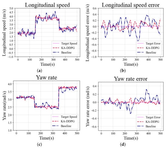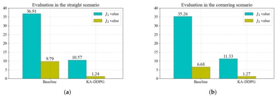 Figure 12a shows the quantitative evaluation in the straight scenario. In 500 s of straight driving, in the KA-DDPG method was reduced by , compared to the baseline. Similarly, of the KA-DDPG method was reduced by , compared to the baseline. The quantitative evaluation demonstrated that the KA-DDPG method has better tracking performance for the longitudinal speed and yaw rate than the baseline in the straight scenario, consistent with the results of the above analysis. The quantitative evaluation in the cornering scenario is shown in Figure 12b. Compared with the evaluation results of the baseline, in the simulation under the cornering scenario, of the KA-DDPG method was reduced by , and was reduced by , when compared to the baseline. These quantitative evaluations in different scenarios demonstrate that the KA-DDPG method has better desired value tracking performance than the baseline.