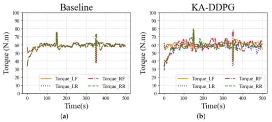 Figure 9 shows the torque distribution curves for each wheel in the straight scenario, and the torque distributions of the two different methods had similar trends. However, the driving torques of the KA-DDPG algorithm reflect the vehicle’s situation more quickly than the baseline, which explains why the KA-DDPG algorithm presented better tracking performance than the baseline.