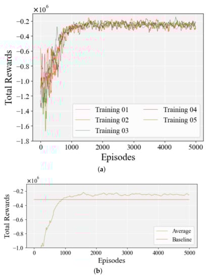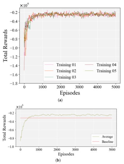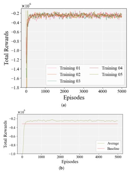 Then, we trained the KA-DDPG, including only the guiding reward method and without the criteria action method, in order to illustrate the contribution of the criteria action method. Figure 14 shows the learning process of the KA-DDPG, without the assistance of the criteria action method. Without the assistance of criteria actions, execution actions were searched randomly at the beginning of the learning process, making the rewards more volatile. As the number of episodes increased, the volatility of the total rewards decreased, and the learning process converged stably. Figure 14a shows the total rewards in each learning process, and Figure 14b shows the average of the total rewards. Without the assistance of the criteria action method, the KA-DDPG needed about 800 episodes to perform better than the baseline, while the first case (including both assisted learning methods) only took about 200 episodes to achieve the same result. Similarly, the convergence of KA-DDPG, without the criteria action method, was, also, slower than the first case, taking about 1200 episodes to converge. Such results illustrate that the learning cost of KA-DDPG is greatly increased without the assistance of the criteria action method. The above simulation results demonstrate that the criteria action method reduces the learning cost, by helping the agent to reduce the randomly selected actions in the learning process.