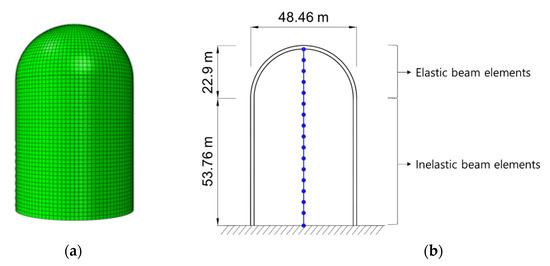 The SPRA in this study was performed for the containment building of the APR 1400 NPP [21]. The containment building was modeled using an LMS model based on the three-dimensional finite element (FE) model illustrated in Figure 1 [22]. The LMS model is composed of 17 beam-column elements, of which 12 elements are for the cylindrical wall part and 5 elements are for the dome parts, as shown in Figure 1. In this study, the backbone curve of bending deformation was derived through the inelastic cross-sectional analysis described in Section 2.2, and the initial stiffness was based on the uncracked section. Table 1 compares the natural frequencies and mass participation factors of each mode obtained from the FE and LMS models. The three-dimensional FE model is axisymmetric, and the two orthogonal horizontal directions have the same modal characteristics. The natural frequencies of the LMS model are slightly higher than those of the FE model because the initial stiffness of the inelastic LMS model represent force-deformation relationship before concrete cracking but the stiffness of the FE model is based on cracked concrete. The mass participation ratios of the LMS and FE models has greater difference than the natural frequencies of the two models. However, the LMS model represents overall good agreement with the FE model. The LMS model was modeled using MIDAS/Gen [23] and is described in more detail below.