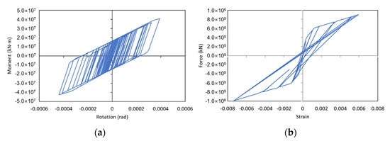 where denotes the outer diameter of the circular wall, and and denote the bending moment and shear force of the wall, respectively, which were calculated from a linear static analysis assuming a seismic force distribution based on the fundamental vibration mode in this study. A peak-oriented hysteresis model was adopted for the inelastic shear-deformation spring [24]. Examples of hysteresis behavior in a flexural plastic hinge and an inelastic shear deformation spring are shown in Figure 3a,b, respectively.
