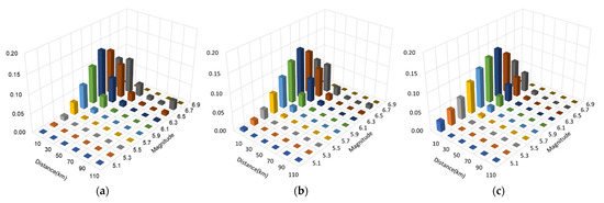 Distribution of the magnitude and epicentral distance for ground motion suite: (a) CS1; (b) CS2; (c) CS3.