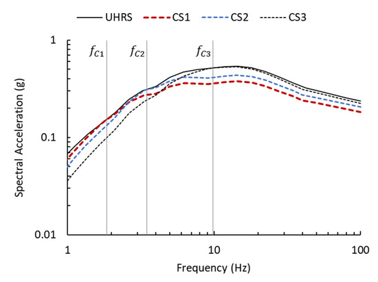 The CS was computed based on the dominant earthquake magnitude and epicentral distance determined by the deaggregation of the PSHA at the control frequency and the corresponding spectral acceleration shared by the reference UHRS. The CS is significantly affected by the control frequency. This study adopted a total of three control frequencies. The first control frequency, , is half the first modal frequency, the second control frequency,, is the first modal frequency, and the third control frequency, , is the second modal frequency. The first control frequency, , is an approximately half of and reflects a decrease in stiffness owing to the inelastic behavior of the containment building subjected to ultimate deformation, although it was not determined in a quantitative manner. Hereafter, the CS derived for the three control frequencies, , and are denoted as CS1, CS2, and CS3, respectively. Table 4 summarizes the control frequencies and corresponding spectral accelerations.