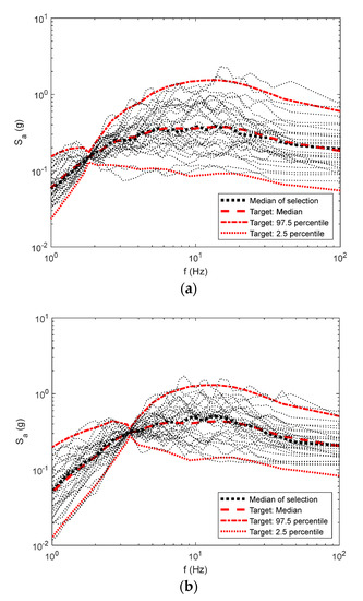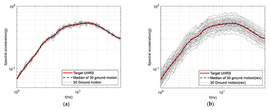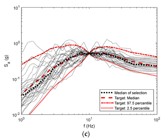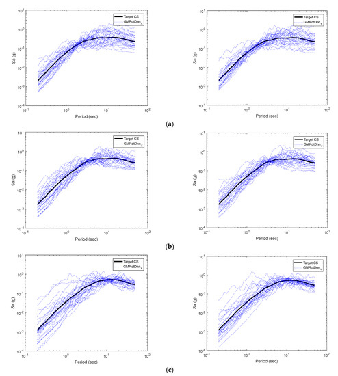 Four suites of ground motion records that matched the four target spectra (UHRS, CS1, CS2, and CS3) were prepared. Each suite comprised 30 pairs of horizontal ground motions in orthogonal directions. For the UHRS, randomness due to peaks and valleys in the spectral shape was neglected under the premise that such randomness was already reflected in the PSHA. Thus, the waveform of the ground motion records was modified using a spectral matching procedure [31]. The ground motion suite for CS2, described below, was used as the seed motion for spectral matching with the UHRS. Spectral matching was conducted in accordance with requirement “Option 2: Multiple Sets of Time Histories” of SRP 3.7.1 [32]. The response spectra of the modified ground motion records matched the target UHRS well, as compared in Figure 6a.