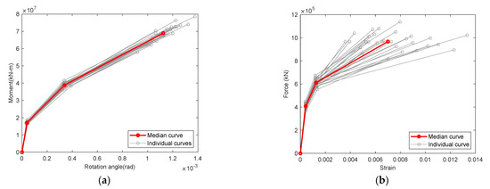 Median load–deformation curves for five inelastic beam element groups, in order from the bottom: (a) Bending; (b) Shear.