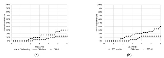 In the incremental dynamic analysis, the two limit states for bending and shear were checked, and the contribution of each limit state was examined. Figure 11 shows the probability of failure induced by bending, shear, and both bending and shear from the IDA for ground motion based on CS3. The probability of failure by shear completely overlaps that by both bending and shear for both the median and LHS models. The same tendency is observed in IDA for ground motion based on other reference spectra, such as UHRS, CS1, and CS2. Therefore, all the seismic fragility curves derived below were consistently governed by the limit state of shear deformation.