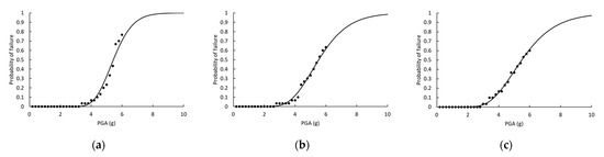 where is the intensity measure defining the seismic hazard curve, which is the PGA for the UHRS and the spectral acceleration at for the CS. is the seismic fragility curve defined as the conditional probability of failure when a specific value of occurs. is the seismic fragility curve presented in Figure 13, and all of them were defined by PGA, which was substituted with the spectral acceleration at 100 Hz in this study. To unify the convolution variables, the PGA was represented by using the following equation:
