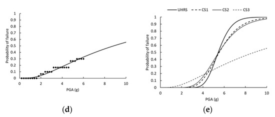 A seismic fragility curve in the form of a lognormal distribution was derived based on the frequency of exceeding the limit state criteria for shear obtained from IDA. Although the analysis was performed up to a PGA of 6.0 g, the probability of failure reached up to 70% only. The maximum likelihood method proposed by Baker (2014) was used to estimate the median and standard deviation of the lognormal distribution by using a limited range of samples [38]. Table 5 summarizes the median PGA and lognormal standard deviation of each seismic fragility curve. The seismic fragility curves obtained using different seismic input models are plotted in Figure 12 and Figure 13 for the median and LHS models of the containment building, respectively. To confirm the suitability of the seismic fragility curve in each figure, the probability of failure calculated for each step of the IDA is plotted with circles in Figure 12 and Figure 13. A good agreement between the raw data and the curve can be seen. Comparison among fragility curves is given in Figure 12e and Figure 13e for median and LHS models, respectively. It is observed that the order of the probability of failure changes between the median and LHS models due to difference in logarithmic standard deviations. The fragility curves based on UHRS and CS1 has the lowest probability of failure in the low PGA region for median and LHS models, respectively.