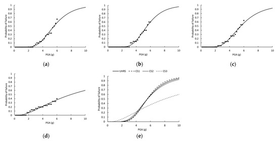 Seismic fragility curves for median models: (a) UHRS; (b) CS1 with ; (c) CS2 with ; (d) CS3 with ; (e) all fragility curves.