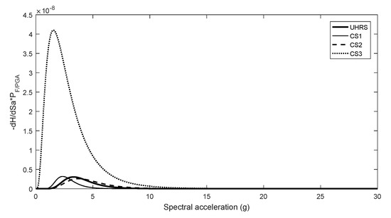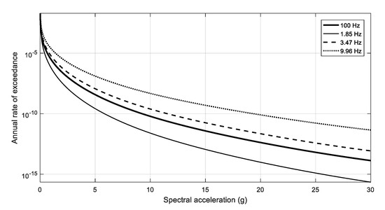 where is the conversion factor listed in the last column of Table 4, based on the spectral accelerations for a return period of 10,000 years. The hazard curve for the spectral acceleration at 100 Hz and the three control frequencies, CS, is plotted in Figure 14, and the integrand of Equation (10) representing the probability density of failure is shown in Figure 15. Table 8 summarizes the calculated failure probabilities. For UHRS, it is not rational to select a single curve among seismic hazard curves defined at different frequencies because the UHRS has the same probability of exceedance for each frequency. Therefore, the UHRS-based seismic fragility curve was convolved with the seismic hazard curve for 100 Hz and the three control frequencies respectively. Moreover, the CS-based seismic hazard curve was convolved with the seismic hazard curve for the corresponding control frequencies.
