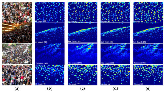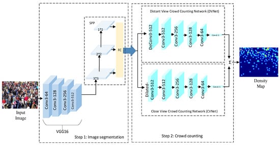 With the high-speed improvement in computer technology, crowd counting has many applications in reality, such as public safety management, urban planning, and intelligent decision making. After a few decades of study, researchers have proposed many competitive crowd counting algorithms. Generally speaking, the method of machine learning was mainly used in early crowd counting. The characteristics of people were mapped and processed by detection [2] or regression [3], so as to obtain the sum of people in images [4,5] or videos [6]. However, these processing methods cannot obtain high-level spatial distribution information from images. The count of large-scale objects was counted by a density estimation-based approach. It can not only estimate the density map but also account for the number of objects in any zone of a map by combining spatial information.