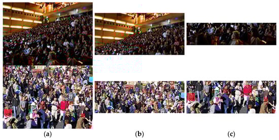 Segmentation Based on Scene Adaption. (a): input image samples; (b): distant view image; (c): close-up view image. Two dense scene images are divided adaptively with the division ratio of 0.34 and 0.52, respectively.