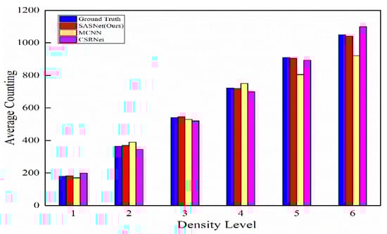 In addition, to evaluate the feature representations of the proposed SASNet from diverse scenes with various crowd density scenes, we divided the ShanghaiTech Part_A test set into six groups according to the number of people in each scenario. Each set indicates a specific density level and the corresponding average number of people. We compared our method with two existing classic representative counting networks, MCNN and CSRNet. The MCNN performs well in the relatively sparse scenes, and the CSRNet performs well in crowded scenarios. However, the proposed HSRNet outperforms the two models in all groups, which further proves that our approach can generate more precise density maps in crowd heterogeneous distribution scenes. Figure 4 shows the histogram of the results.