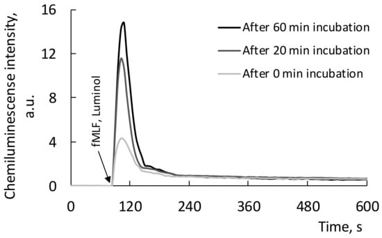 After incubation, cell chemiluminescence intensity was measured. For this, luminol solution (Enzo Life Sciences, Lausen, Switzerland) at the final concentration of 0.35 mM as well as fMLF, an activator of ROS generation by neutrophils (Sigma-Aldrich, Saint Louis, MO, USA), at a final concentration of 2 µM were added to all samples immediately before measurement. To register the chemiluminescence kinetics, the cuvette was immediately placed in a chemiluminometer (DISoft LLC, Moscow, Russia). Representative kinetic curves are shown in Figure 2.