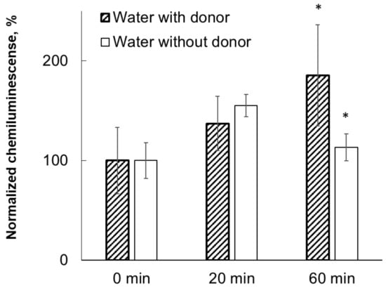 All experiments were carried out in 6 independent repetitions. During the incubation (after 0, 20, or 60 min), an aliquot was taken from the cuvette with the acceptor sample, which was then used to assess the activity of solutions by cell chemiluminescence assay.