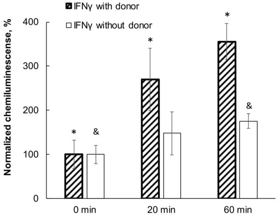 Maximum chemiluminescence intensity of a suspension of neutrophils after the addition of an IFNγ solution jointly or separately incubated with samples of HD Abs to IFNγ. The samples contained: suspension of neutrophils—2.5 × 105 cells; an IFNγ solution (10 ng/mL) incubated for 0, 20, and 60 min in the presence of HD Abs to IFNγ (hatchet bar) or in the absence of HD Abs to IFNγ (white bar), which constituted 80% of the total sample volume; fMLF (2 µM); luminol (0.35 mM). Measurements were performed at 37 °C and pH 7.4; * p < 0.05 (in comparison with “0 min” for samples incubated with donor), & p < 0.05 (in comparison with “0 min” for samples incubated without donor).