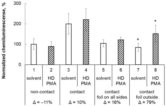 Maximum chemiluminescence intensity of a suspension of neutrophils after the addition of a 0.5% ethanol solution jointly or separately incubated with HD PMA samples with shielding. The samples contained: suspension of neutrophils—2.5 × 105 cells; sample of 0.5% ethanol (white bar) or HD PMA (hatched bar) incubated for 60 min: separately (columns 1 and 2), jointly (columns 3 and 4), jointly, but the cuvettes are wrapped with foil on all sides (columns 5 and 6), jointly, but the cuvettes are wrapped with foil on all sides, except for the side with which the two cuvettes were in contact (columns 7 and 8); fMLF (2 µM); luminol (0.35 mM). Both donor (HD PMA) or acceptor (0.5% ethanol) samples were analyzed in chemiluminescence assay and accounted for 80% of the total volume. Measurements were performed at 37 °C and pH 7.4; * p < 0.05 (intragroup comparison).