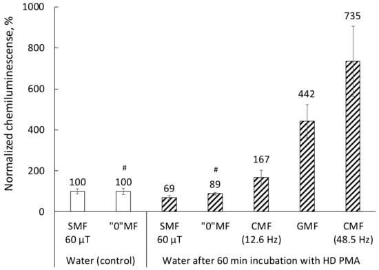 Maximum chemiluminescence intensity in a suspension of neutrophils after the addition of water preincubated with HD PMA in different magnetic fields. The samples contained: suspension of neutrophils—2.5 × 105 cells; water sample incubated for 0 min (empty bar) and 60 min (hatched bar) at: SMF (60 μT), “0”MF (“magnetic vacuum” ~<20 nT), CMF (12.6 Hz)—combination of static (60 μT) and alternating magnetic field (100 nT), which is formed according to the sinusoidal regime at 12.6 Hz, CMF (48.5 Hz)—combination of SMF (60 μT) and AMF (100 nT), which is formed according to the sinusoidal regime at 48.5 Hz, GMP—outside the controlled magnetic field generating device; fMLF (2 µM); luminol (0.35 mM). The acceptor (water) accounted for 80% of the total volume of the sample. Measurements were performed at 37 °C and pH 7.4. For all pairwise comparisons within the group “Water after 60 min incubation with HD PMA” p < 0.05; for all comparisons of corresponding samples between groups “Water after 60 min incubation with HD PMA” and “Water (control)” p < 0.05 (except samples which were incubated in “0” MF. For these # p > 0.05).