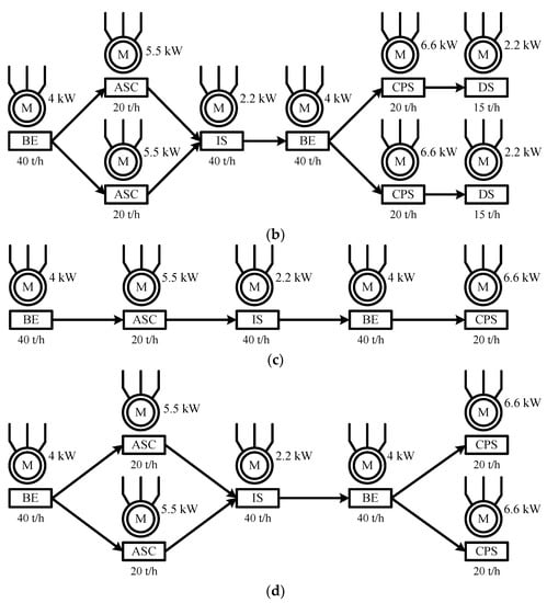 Technological schemes of ZAV-40 grain cleaning unit: M—induction motor, BE—bucket elevator, ASC—air screen cleaner, IS—intermediate screw, CPS—centrifugal pneumatic separator, DS—disc separator.