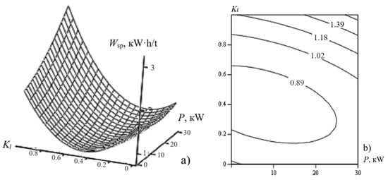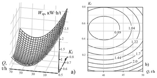 - Two-dimensional cross-section of the response surface characterizing the unit capacity and the load coefficient of electric motors (Figure 3) at x2 = 0:the values of factors in physical units are equal toQ = 31.7 t/h; Kl = 0.39 and Wsp. = 0.94 kW·h/t.