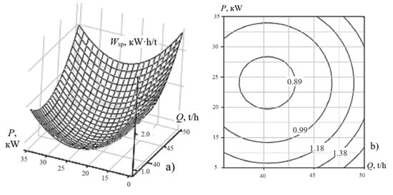 - Two-dimensional cross-section of the response surface characterizing the unit capacity and the connected capacity of electric motors (Figure 4) at x3 = 0:the factors in physical units are equal toQ = 24.7 t/h; P = 4.9 kW and Wsp. = 0.81 kW·h/t.