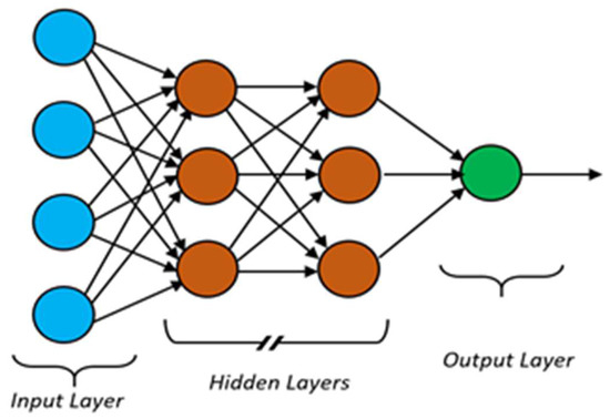 A back-propagation neural network (BPNN) is a feed-forward type of artificial neural network that consists of three different types of layers. The three layers are known as the input layer, followed by the hidden layer(s) and, finally, the output layer. The number of hidden layers can be adjusted depending on the nature of the problem that is involved. The number of nodes, which are also known as neurons, in the input layer is selected in such a way that it matches the quantity of input features; similarly, the number of nodes or neurons in the output layer is equivalent to the number of outputs [29]. All of the processing elements, which are also known as nodes or neurons, in every layer are fully interlinked to the neurons that are in the succeeding layer through weighted connections. The inputs to the hidden layers are multiplied by the weights that are associated with the respective neurons and are then added together by the hidden layer to produce a summed output. This summed output is then passed through an activation function, such as sigmoid, tan-sigmoid or threshold functions [30]. Due to the simplicity, efficient performance and ease of implementation, it is one of the most extensively used neural networks. The general architecture of a BPNN with one output is shown in Figure 2.