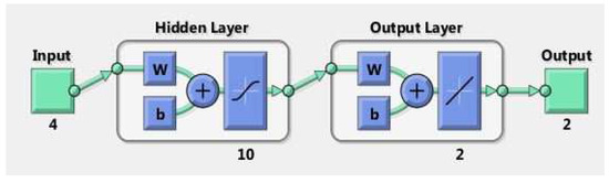 The architecture of the BPNN that was used in this study, with four input parameters, ten neurons in the hidden layer (best performance case) and two outputs, is shown in Figure 4.