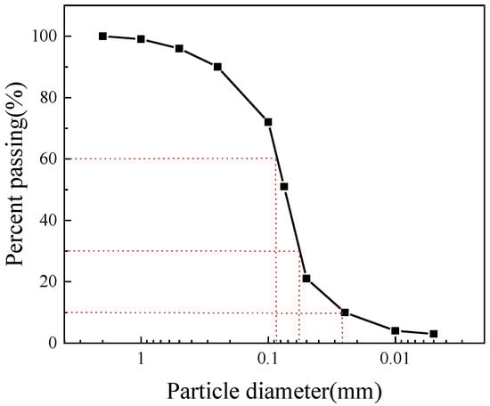 Figure 1 shows the grain-size distributions curve of the sand used in the model test. It can be seen from the figure that the gradation of the sand used in this test is continuous. According to the geotechnical test specification, the measured parameters of the soil sample are as follows: the specific gravity of soil particles is 2.634, the internal friction angle of sandy soil is 35°, the natural void ratio is 0.742, the dry density is 1.510 g·cm−3, and the saturated density is 1.936 g·cm−3.