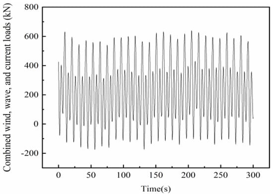 According to the actual wave parameters, the water depth in this test is 5 m, the current velocity is 0.88 m/s, the wave height is 2.13 m, and the wave period is 10.86 s. According to the scope of application of the wave theory proposed by Méhauté (1968) [20], it satisfies the conditions for the use of Stokes’ second-order waves. The calculation results of wave and current loads are shown in Figure 4.