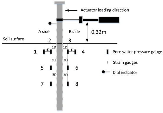 For the measurement of pore water pressure at different positions around the pile during the test, 8 pore water pressure gauges were used, and the arrangement of the pore pressure gauges adopted the arrangement suggested by Norris (2003) [22]. In the shallow soil, four pore water pressure gauges are arranged before and after the axis of the pile body, which are divided into two categories: far field and near field. Two pore water pressure gauges are arranged in the middle soil body and the deep soil body at the position of one pile diameter before and after the axis of the pile body, which are only arranged in the near field.