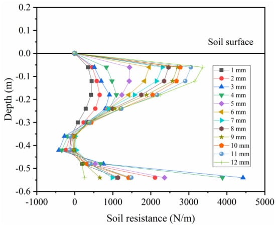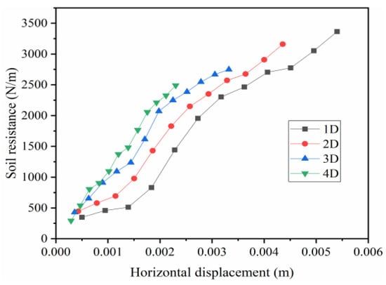 Figure 10 shows the soil resistance of the pile body and the displacement of the pile body through quadratic differentiation and difference after fitting the measured bending moment data. Finally, the graph of the change of soil resistance around the pile with the horizontal displacement of the pile body at different depths (1D~4D) of the soil body is obtained, and 1D~4D in the figure represents the depth of the soil layer from the soil surface. It can be seen from the figure that with the increase in the horizontal displacement of the pile body, the soil resistance at different depths under various loads gradually increases, but the development trend of soil resistance does not slow down whether it is the surface layer or the deep soil. When the soils at different depths have the same displacement, the soil resistance of the deep soils increases more. When the soils at different depths reach the same soil resistance, the displacements of the shallow soils are larger than those of the deep soils.
