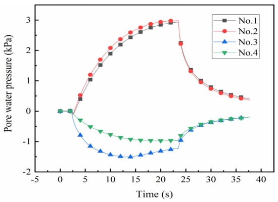 Figure 11 shows the test results of the pore water pressure at different positions around the pile in the shallow soil in the static load model test. During the test, at the position of the No. 1 and No. 2 piezometers on the front side of the pile body, when the pile body is subjected to an external load, the soil on the front side of the pile body is squeezed, so the pore water pressure at this position rises. When the loading is stopped, the pore water pressure of the soil at the surface dissipates rapidly. For the No. 3 and No. 4 piezometers on the back of the pile body, due to the action of horizontal load, the pile and soil are separated, and the gap between the pile body and the soil is quickly filled with water. When the pile body continues to move forward, the soil behind the pile produces negative pore pressure. With the increase in the displacement of the pile body, the negative pore pressure of the soil at the positions of the No. 3 and No. 4 piezometers behind the pile also increases gradually. The pore pressure of the No. 3 piezometer, which is closer to the pile body, has a greater increase. Because the closer to the pile, the greater the soil displacement and the greater the negative hole pressure. As the loading stops, the pore water redistribution in the soil causes the pore water pressure to gradually fall back to the hydrostatic pressure value at the water level.