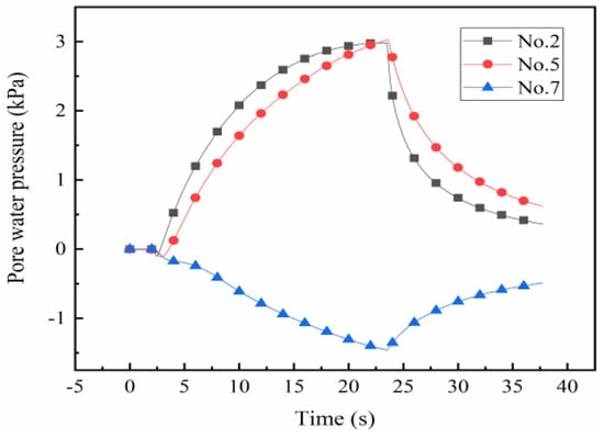 Figure 12 shows the results of the pore water pressure in the soil measured by arranging pore pressure gauges at the same distance and different depths on the A side of the pile body during the model test. The positions of the 2, 5 and 7 hole pressure gauges in the figure are shown in Figure 4. As shown in the results in the figure, the pore pressures monitored by No. 2 and No. 5 porosimeters gradually increased as the loading progressed. However, due to the tendency of the pile body to deviate from the soil, suction is generated at the position of the No. 7 pore pressure gauge, and the negative pore water pressure at this position also gradually increases. Judging from the absolute value of pore water pressure, the pore water pressure of No. 7 porosimeter is not as large as that of No. 2 and No. 5 porosimeters. It may be due to the fact that the deep soil body has a large constraint on the pile, and the displacement generated under the load is small.