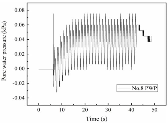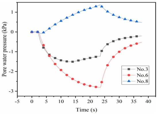 Similarly, Figure 13 shows the results of the pore water pressure in the soil measured by arranging piezometers at the same distance from the pile body and at different depths in the soil behind the pile. It can be seen from the figure that the soil at the 3 and 6 hole pressure gauge positions behind the pile body generates suction due to the separation of the pile and soil. Moreover, as the loading progresses, the pore water pressures at both positions increase, but the pore pressure of the No. 3 pore pressure gauge in the shallow soil body and the No. 6 pore pressure gauge in the middle soil body are not consistent. It may be due to the fact that the porosimeter in the topsoil is closer to the water surface, and the voids at the mud surface are larger, so the measured pore water pressure is not as large as that of the middle soil. However, the pore pressure changes measured by the No. 8 pore pressure gauge at the deeper soil body are consistent with the aforementioned situation. The soil in front of the pile is squeezed at this position, and the pore water pressure has increased.