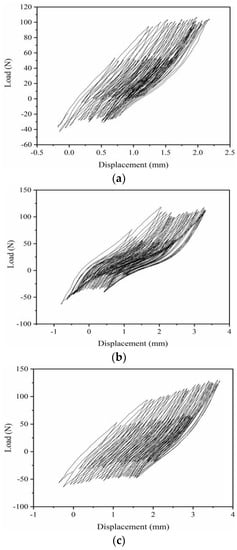 The load–displacement curves. (a) The load–displacement curve of Group D1; (b) the load–displacement curve of Group D2; (c) the load–displacement curve of Group D3.
