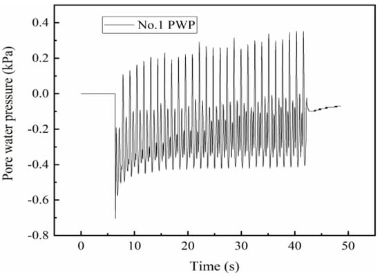 Figure 15 shows the variation of pore water pressure at the position of No. 1 piezometer in the soil around the pile body in the model test. It can be seen from the figure that in the whole test process, the change trend of pore pressure is basically consistent with the change form of load. At the same time, it can be seen that the peak pore pressure at the position of the No. 1 pore pressure gauge has a certain increase with the action of the simulated wind, wave and current load. However, since the pore pressure gauge is located in the surface soil at a depth of 1 times the pile diameter from the soil surface, the increase in pore pressure caused by the drainage effect is not obvious.