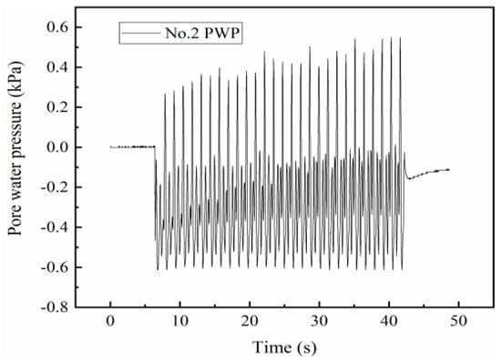 Figure 16 shows the change of pore water pressure in the soil around the pile measured by the No. 2 piezometer which is close to the pile body. Compared with the No. 1 piezometer, because the vertical distance from the pile body is shorter, the soil at this position has a greater response to the load, so the resulting displacement is more significant. The overall pore water pressure change amplitude is significantly higher than the monitoring value of No. 1 porosimeter. The overall fluctuation form of pore pressure is still basically consistent with the load form. Due to the short distance from the pile body, the reciprocating motion of the pile foundation will cause a drainage channel between the pile body and the soil body, resulting in contact seepage. Therefore, the accumulation of pore pressure is still not obvious, but the peak pore pressure has a certain increase.