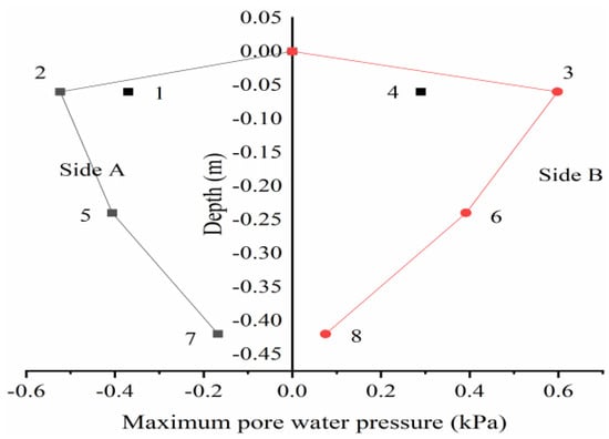 The results of the pore water pressure measured by the porosimeters at 8 different positions in Figure 8, and the results of the distribution of the maximum pore water pressure at each position along the depth are drawn in Figure 18. Since the soil surface is drained, the pore water pressure on the soil surface is zero. It can be seen from Figure 18 that, in general, the pore water pressure in the soil around the pile shows a trend of first increasing and then decreasing along the change of soil depth. At the same time, the smaller the vertical distance from the pile, the greater the variation of pore pressure, as shown in the results of pore pressure gauges 2 and 3. At the same vertical distance from the pile, the pore pressure amplitude of the shallow soil is greater than that of the deep soil. As shown, the results of porosimeter 2 are greater than those of porosimeters 5 and 7 and the results of porosimeter 3 are greater than those of porosimeters 6 and 8.