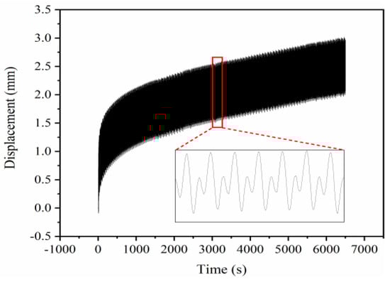 Taking the test results of L2 test group (cyclic load ratio ξ = 20%) as an example, the displacement development results of pile body are explained. It can be seen from Figure 19 that the accumulated displacement of the pile body develops rapidly in the early stage of loading (the first 500 s) due to the gradual displacement of the single-pile foundation to the A side under the action of the cyclic load. However, in the later stage of loading, the increasing rate of the cumulative displacement of the pile body gradually decreases, and the overall displacement curve tends to be flat. From the details of the displacement results, the development trend of the displacement is still consistent with the form of the load.