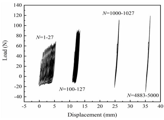 Figure 20 shows the hysteresis curve of horizontal load displacement when simulating normal wind, wave and current load for a long time, taking the L3 test group with the cyclic load ratio ξ as 30% as an example. It can be seen from the load–displacement curves of this group that with the progress of cyclic loading, the area of the hysteresis loop of the load–displacement curve gradually decreases under the same number of loads. It shows that the displacement development rate of the pile body will gradually decrease with the increase in the number of cycles under the long-term load.